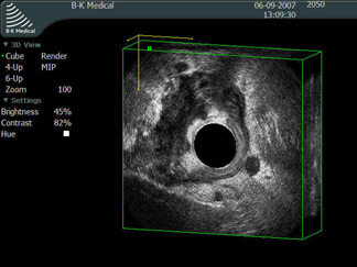 Эндоректальное 3D ультразвуковое исследование - местнораспростаренная опухоль прямой кишки.