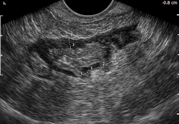 Трансвагинальное 2D ультразвуковое исследование сигмовидной кишки пораженной дивертикулами.